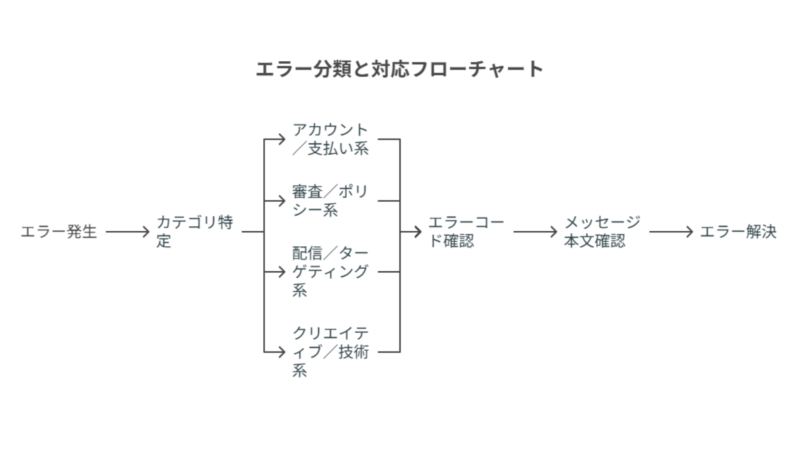 例:画像サイズ不適合、動画フォーマット非対応、リンク先URLのエラー、API/GTM連携不良 など。