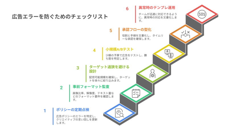 月1で公式の広告ポリシー・エラー参照を確認。アップデート後はクリエイティブの言い回しを棚卸し。