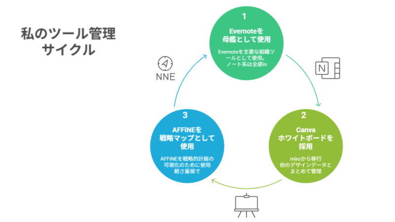 「作業は Canva / 記録は Evernote / 俯瞰は AFFiNE」。